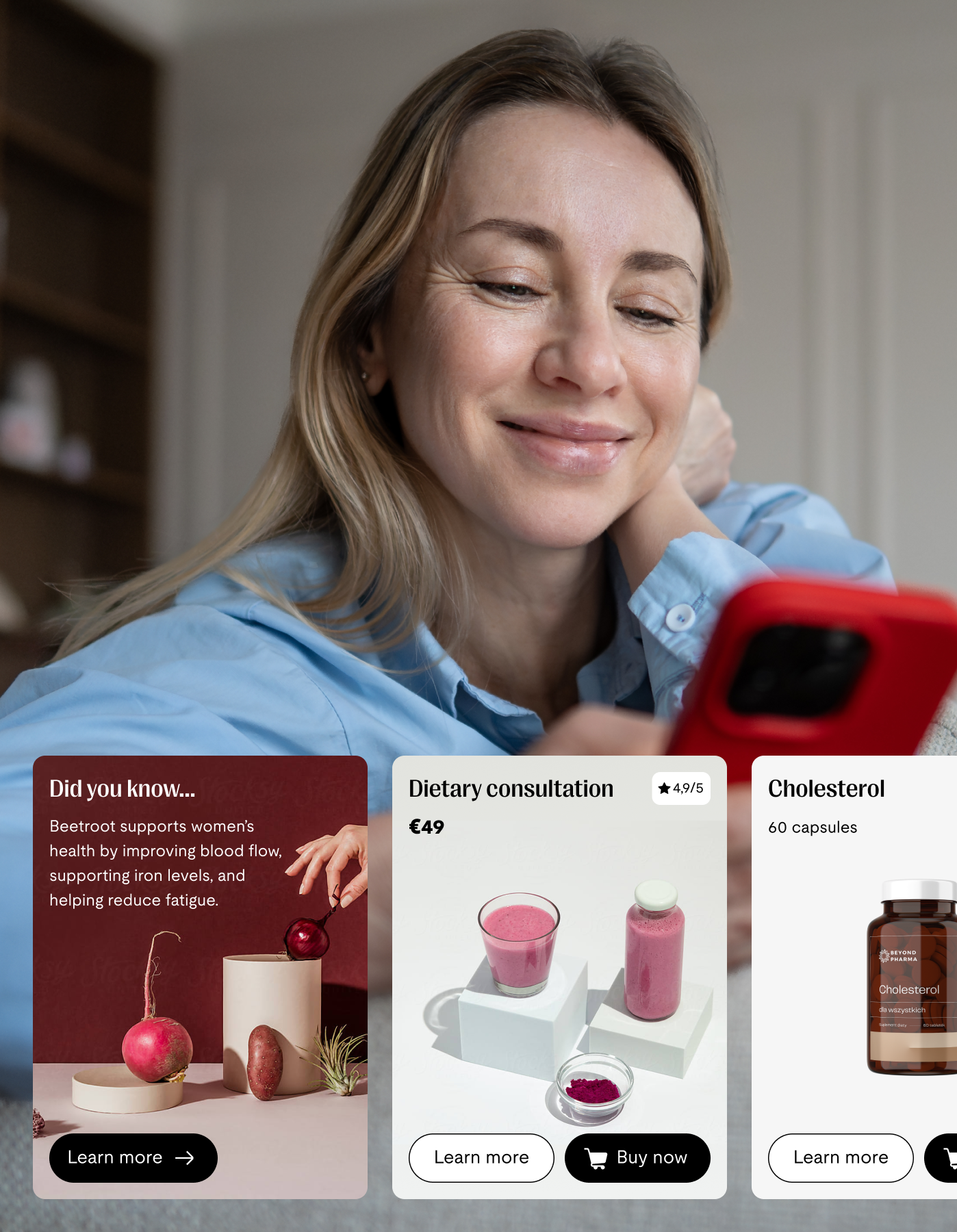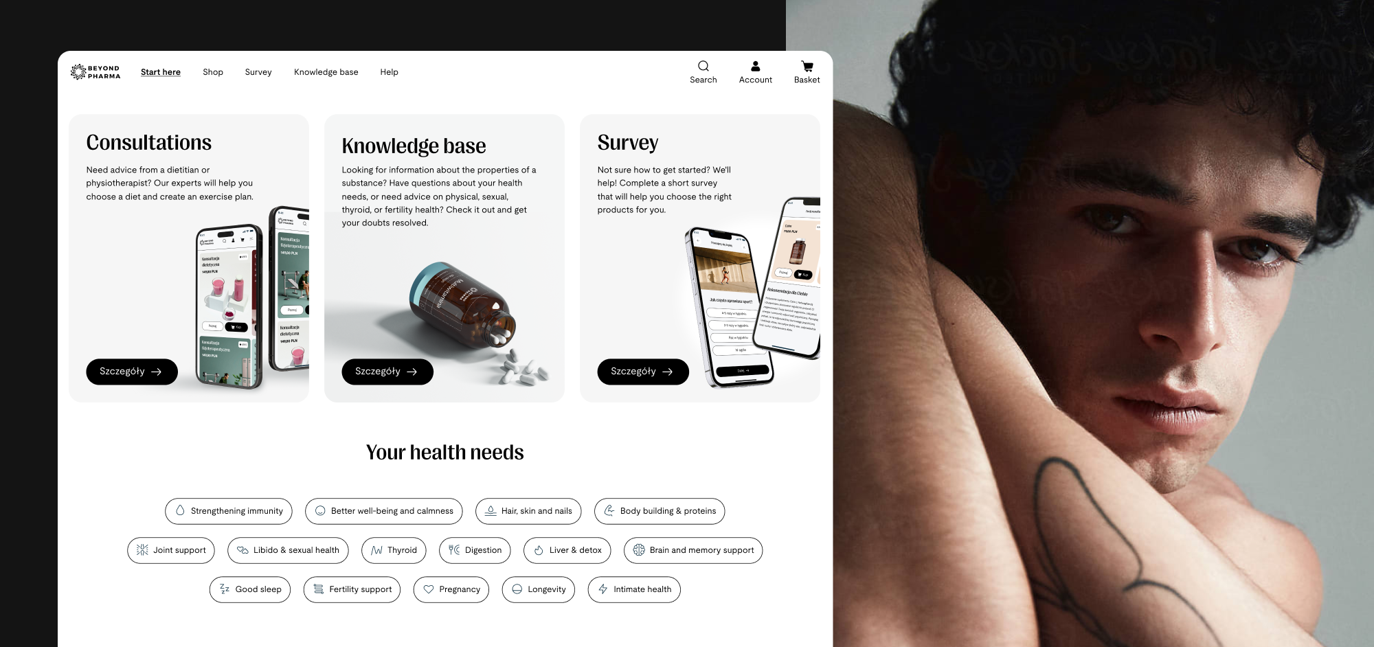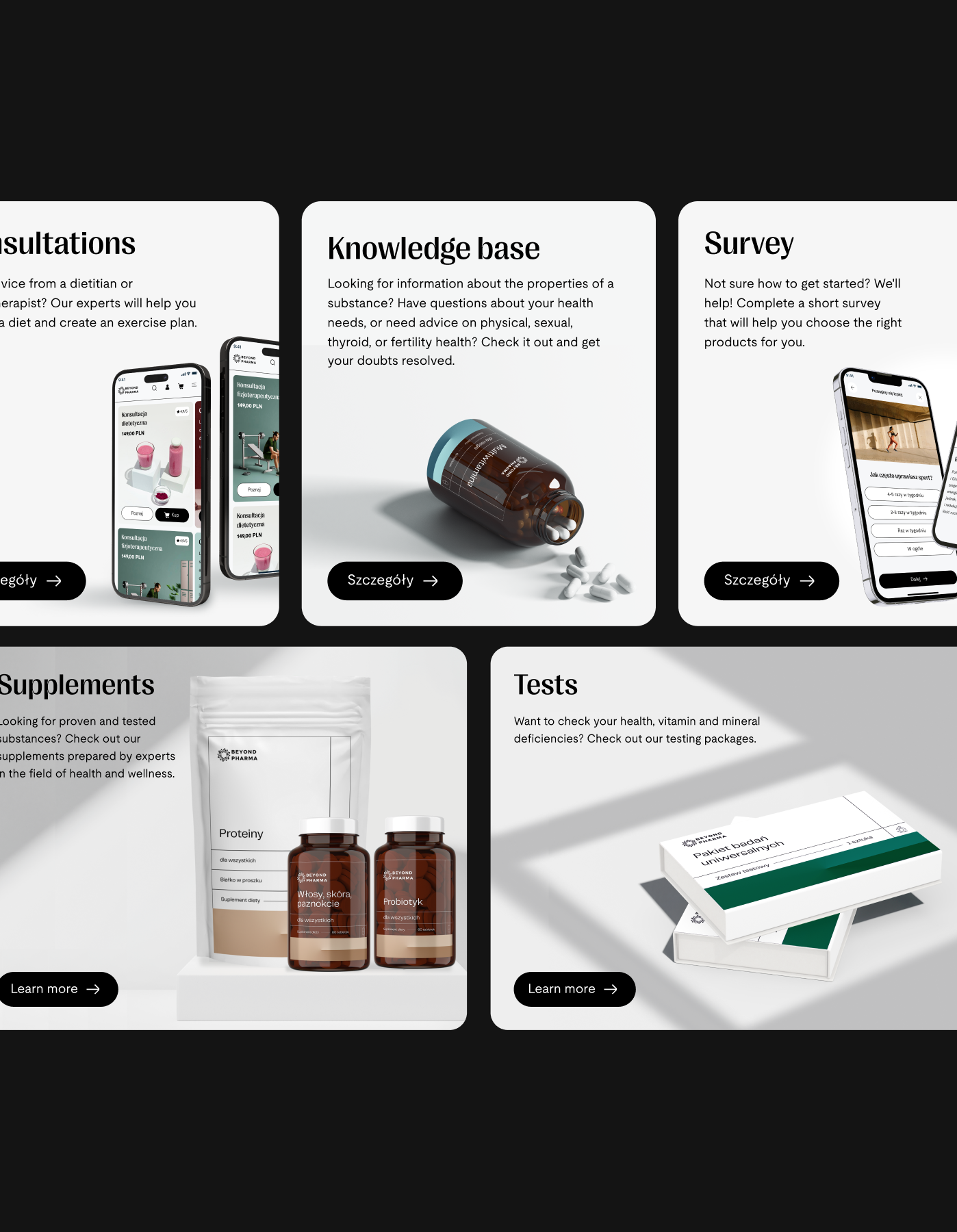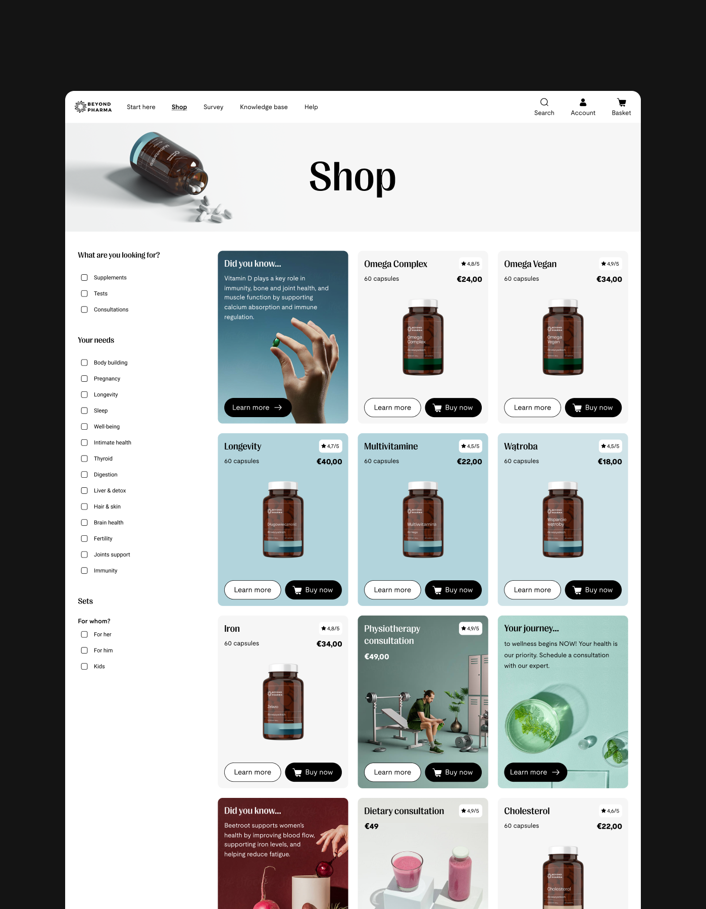 Beyond Pharma positions itself at the intersection of e-commerce and digital health. The platform enables users to assess their health through at-home laboratory tests, receive personalized supplement recommendations, access expert consultations, and consume high-quality medical knowledge sourced from leading research institutions. Rather than offering generic products, the platform was designed to guide users through informed, long-term health decisions supported by data, education, and professional expertise.