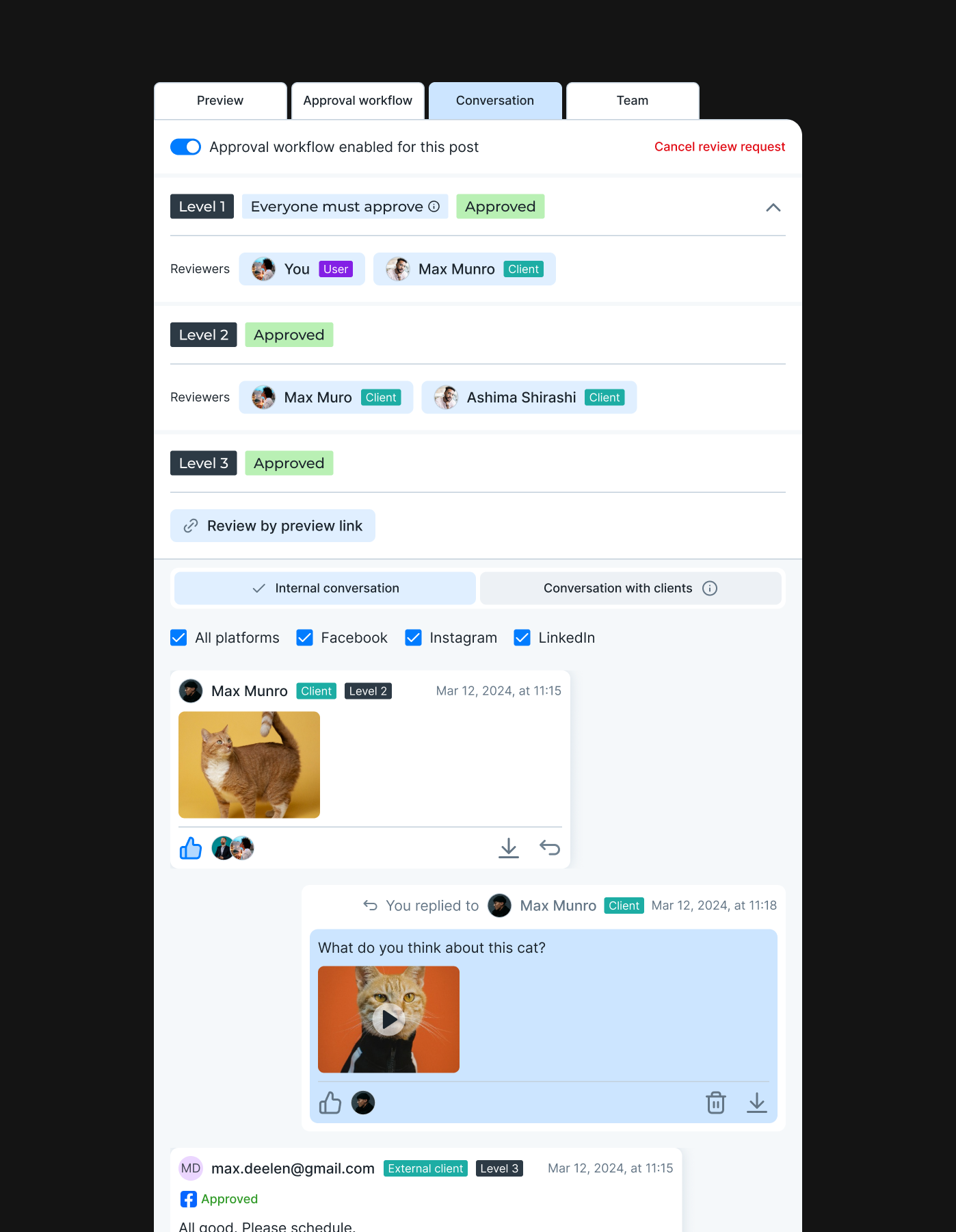 I worked closely with product, customer success, and engineering teams to understand how users actually plan, approve, and publish content. This included analyzing user feedback, reviewing usage data, and running interviews and usability tests with agency teams managing many social profiles.
